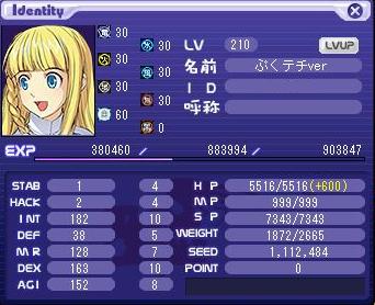 LV:210 STAB 1 HACK 2 INT 135 DEF 38 MR 63 DEX 214 AGI 186